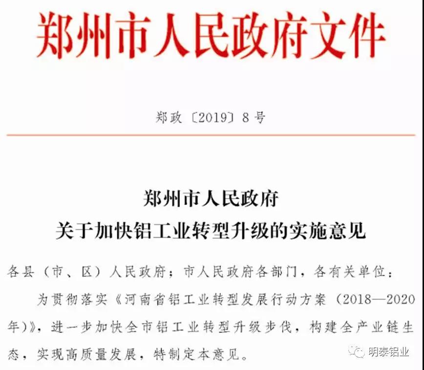 2019年3月18日,為貫徹落實《河南省鋁工業(yè)轉型發(fā)展行動方案(2018—2020年)》,鄭州市人民政府印發(fā)了《鄭州市人民政府關于加快鋁工業(yè)轉型升級的實施意見》(以下簡稱《意見》),《意見》對全市鋁工業(yè)發(fā)展進行了明確的要求和全面的部署。明泰鋁業(yè)近年來加快了轉型升級、綠色化改造、創(chuàng)新發(fā)展及智能化改造的步伐,與鄭州市政府對鋁加工行業(yè)的要求和部署不謀而合。