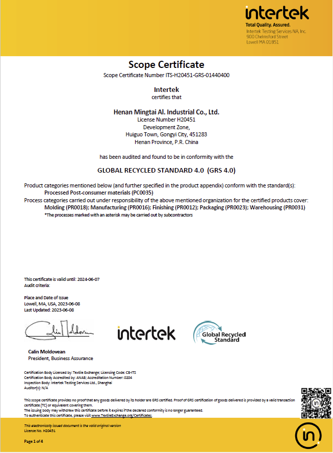 近日,河南明泰鋁業(yè)股份有限公司順利通過“GRS全球回收標準”認證審核,取得GRS4.0標準證書。